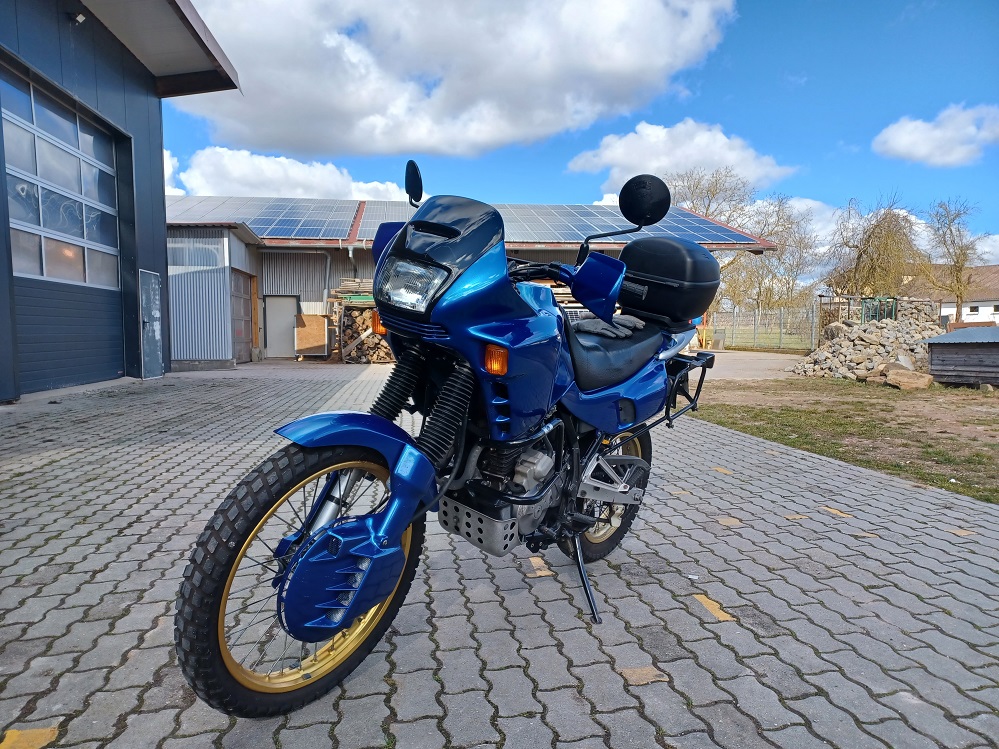 Die blaue Lackierung ist in guter Qualität, Haupt- und Seitenständer, E-Starter